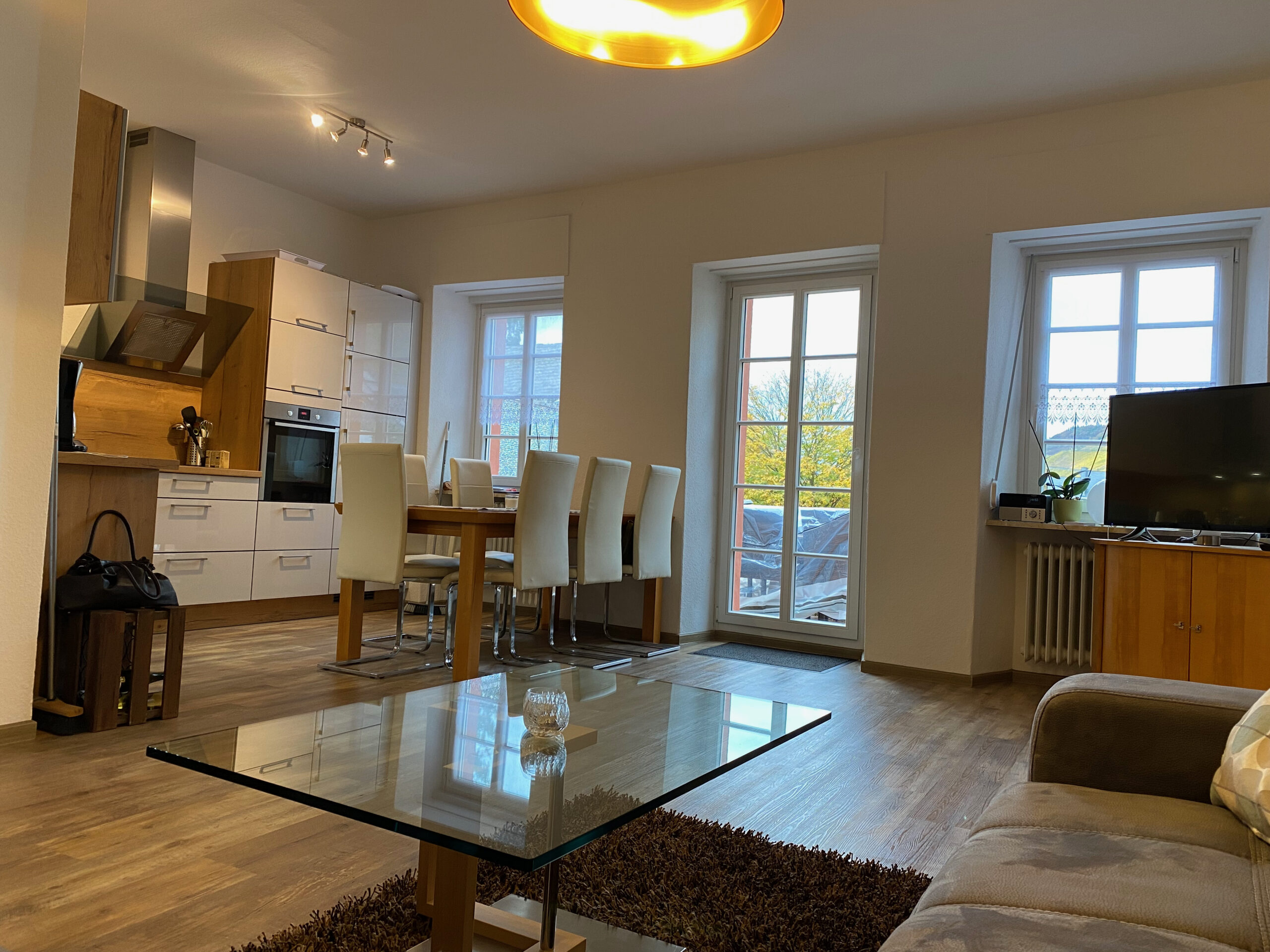 Von dem gemütlichen und offenen Wohn-Essbereich gelangen Sie auf den 14qm großen Balkon mit Blick auf die Weinberge.